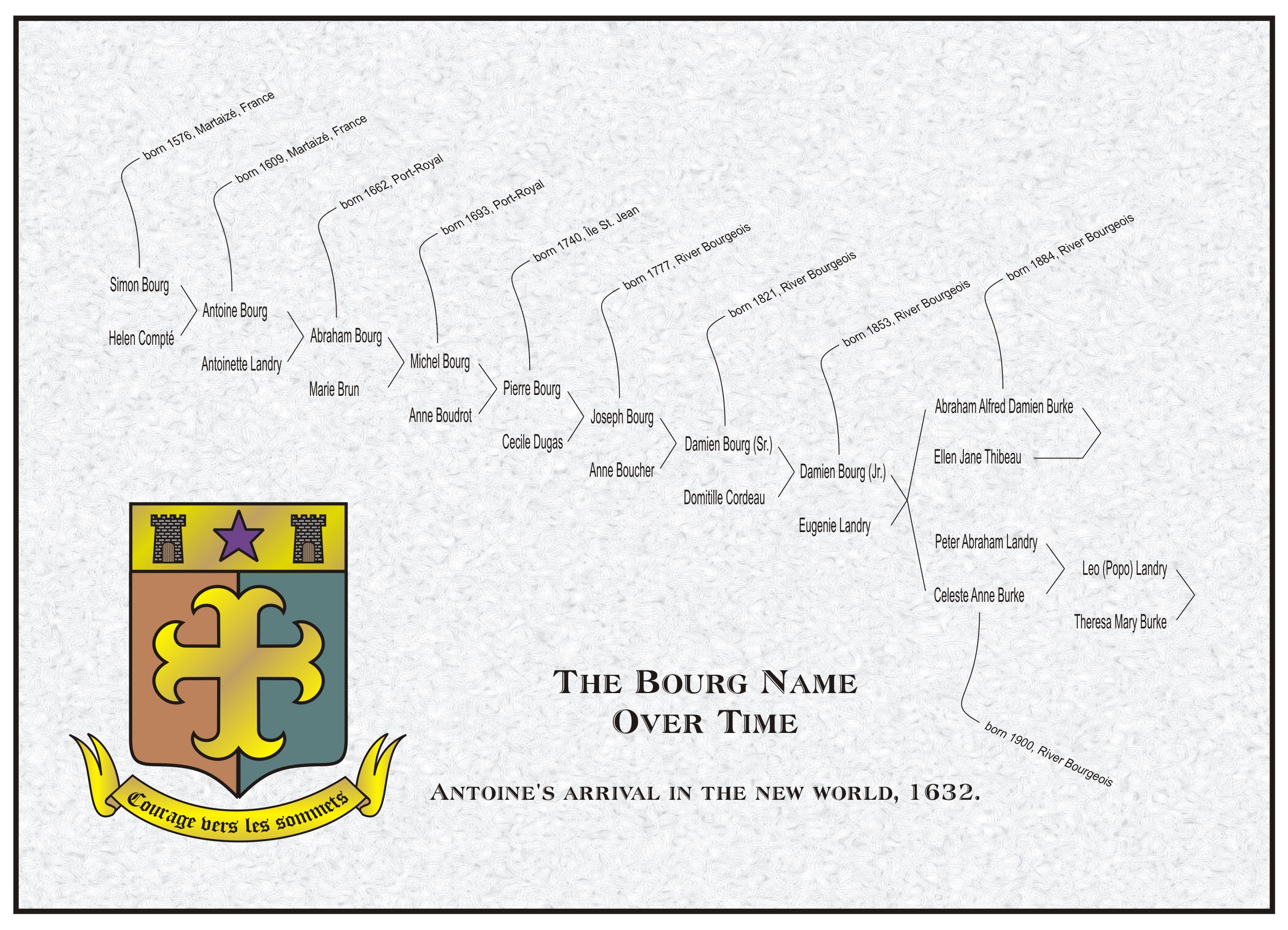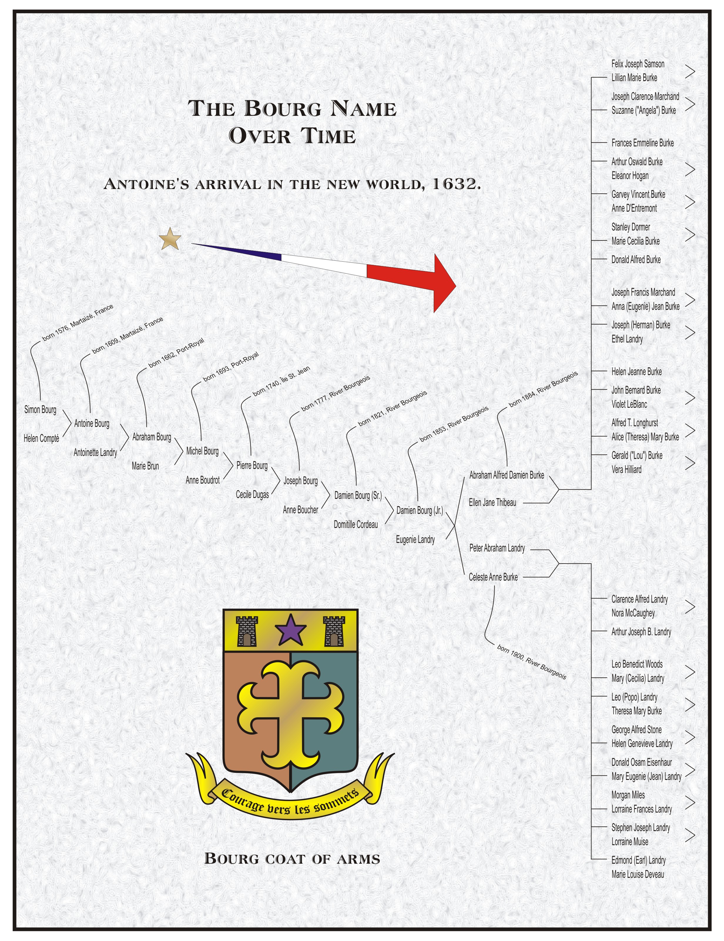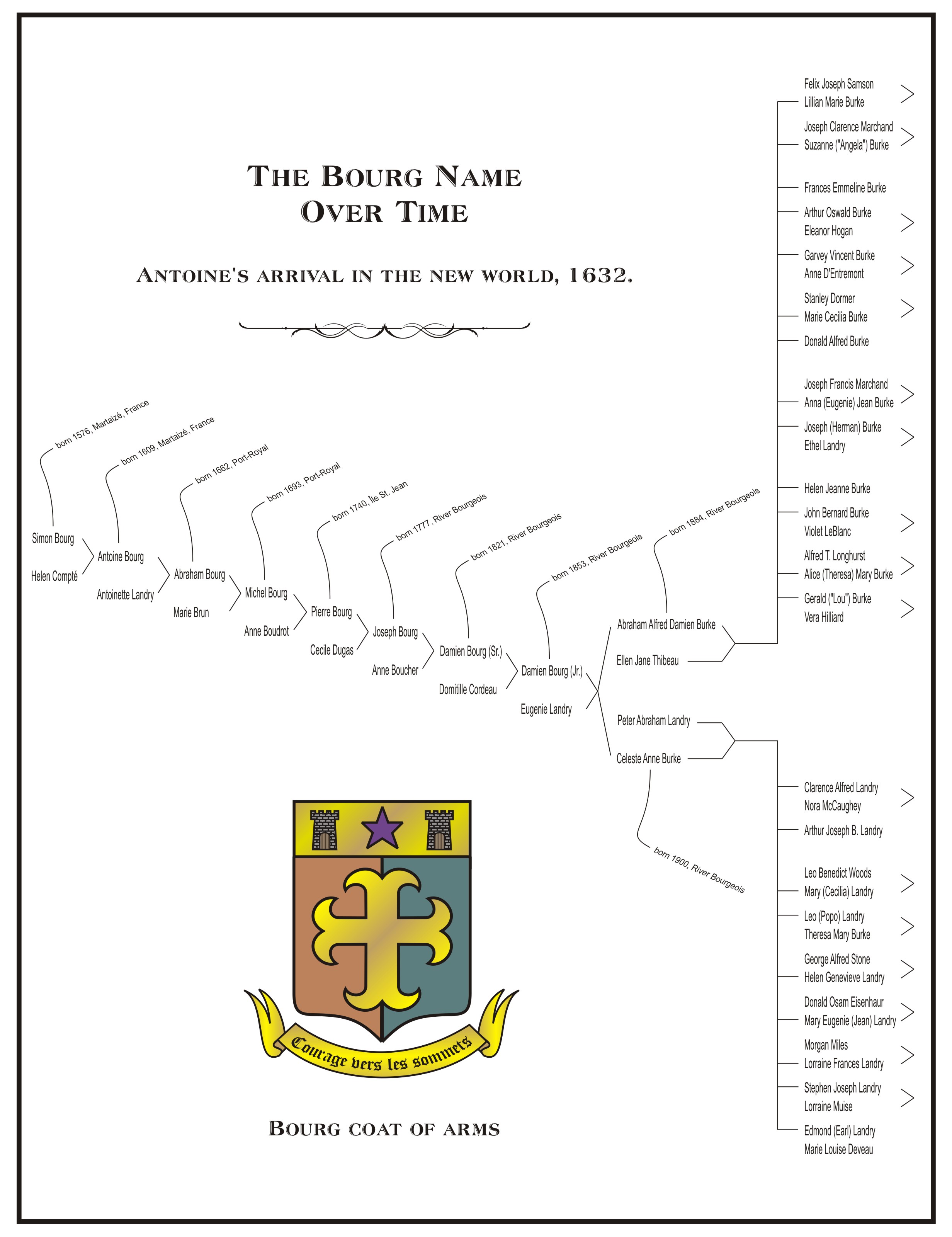 These charts help give an overview of the ancestral line of Damien Burke (Bourg) back to the first Bourg to come to the New World. This was Antoine Bourg, who came to Acadia in 1632, later settling in Port-Royal in 1636. (Follow this link to see more information on Antoine Bourg.)