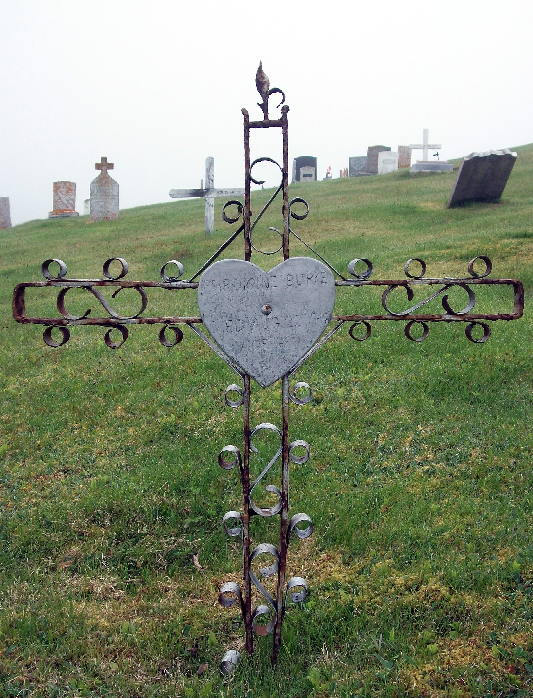 This scrollwork metal grave marker is likely very similar to the scrollwork cross Damien Burke's "heart" was mounted on. This one (erected a few years after Damien's had been) is for Phroisine (or Euphrosine) Burke, who died August 22, 1948, at age 69. The only record I can find close to this is Euphrosine Dugas, born 1879, married to Amos Burke in 1915. Her name was alternatively spelled "Frazine" in the 1921 River Bourgeois census. Amos was a fisherman, and there may have been family or work in Massechusetts that resulted in border crossing records (on which her name was spelled "Alouzine" and Frazen").