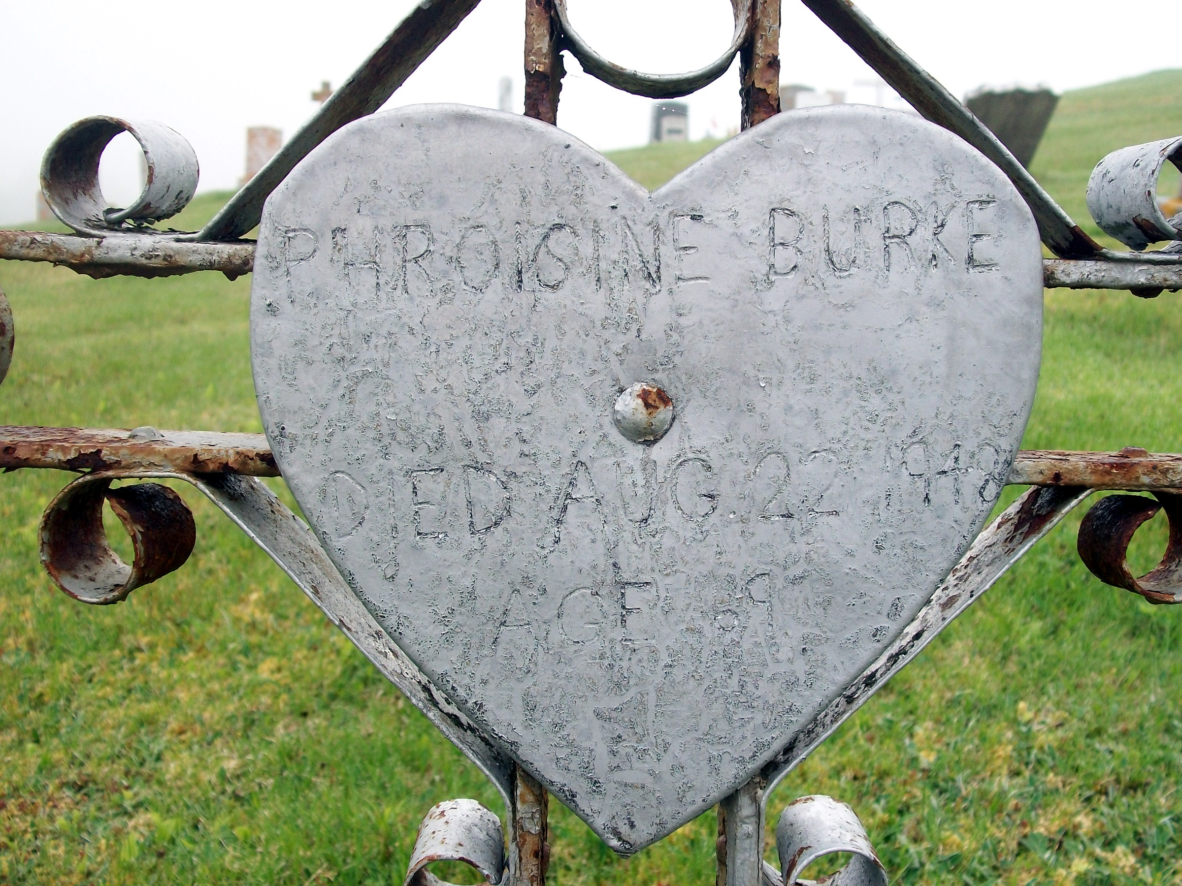 Damien Burke's grave marker is preserved by, and in the possession of, Anne Landry. Approximately 12" in diameter, it was mounted on a cross, "a metal scroll work type".