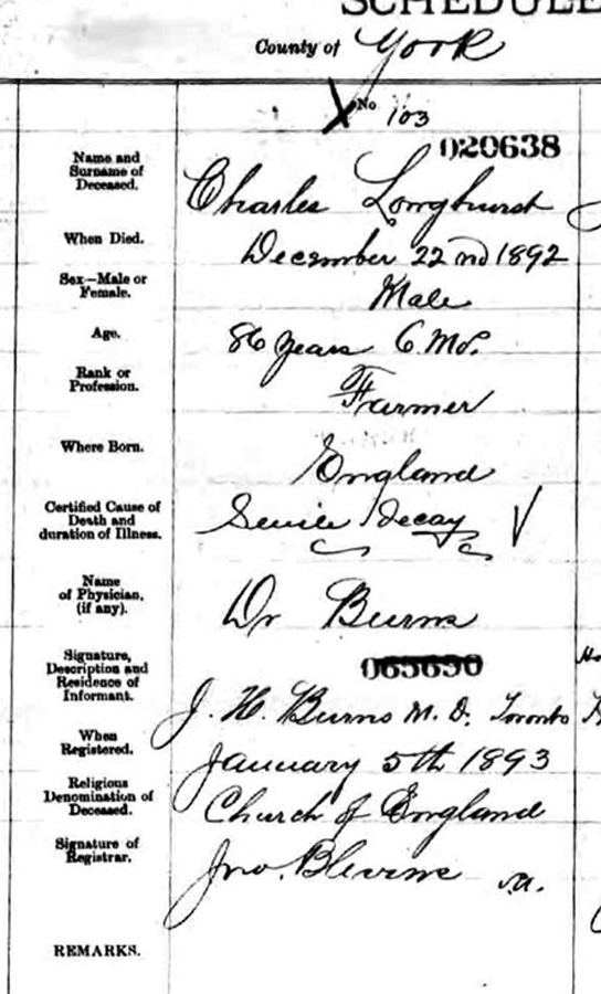 Charles Longhurst died December 22, 1892 in Toronto, Ontario. Record of death shows cause as "senile decay" (i.e. old age).