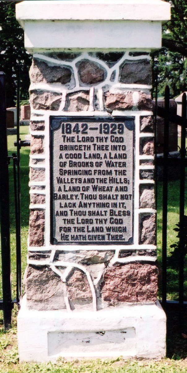 "1842-1929. In memory of those who were the first to come into this Canadian countryside. The cultivated fields, the homes, the school, the church, are existing monuments of their courage, their wisdom, and their piety. A later generation adds this token of gratitiude."