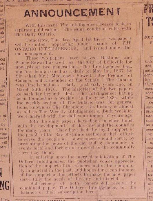 Belleville's "Ontario" Intelligencer came about from the merger of two Belleville newspapers, the Daily Ontario and the Daily Intelligencer.